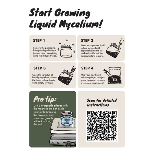 Here's a full list of instructions for using your sterile jar kit! Follow these steps and you'll be growing liquid mycelium in no time.